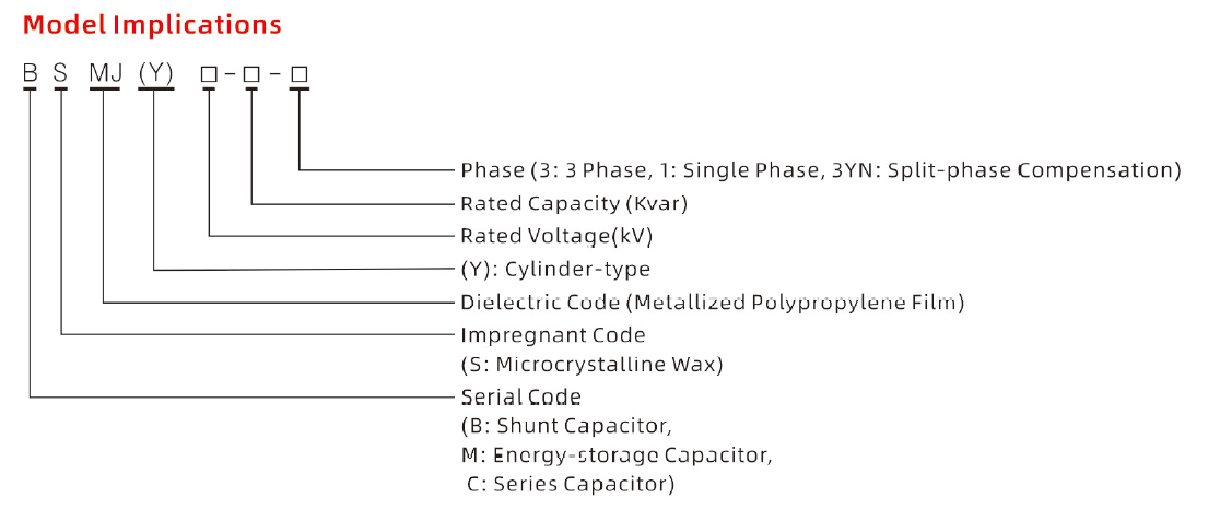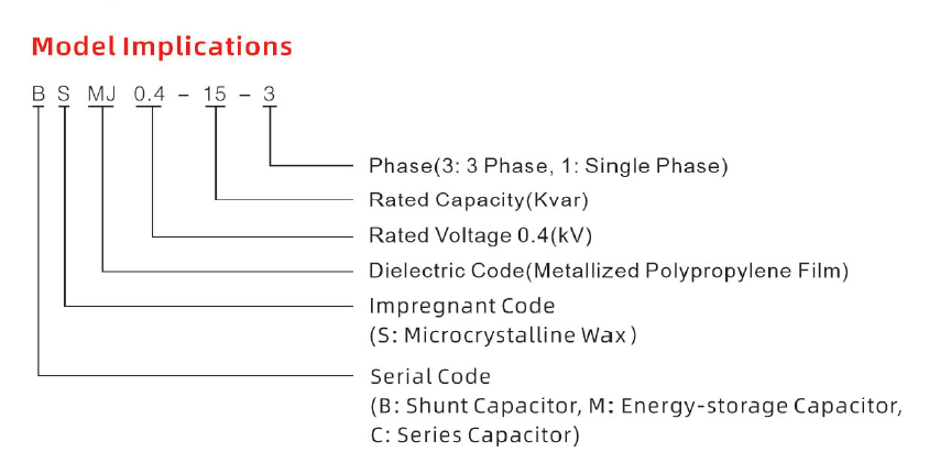 Sebbene gli standard nazionali dell'industria meccanica cinese non specifichino esplicitamente l'esatta designazione della serie per i condensatori shunt autoriparanti a bassa tensione, regolano rigorosamente il modo in cui i produttori dovrebbero denominare una serie di condensatori di potenza utilizzando le lettere. BSMJ è semplicemente una designazione comune di serie di condensatori di potenza conforme alle regole di denominazione standard del settore.